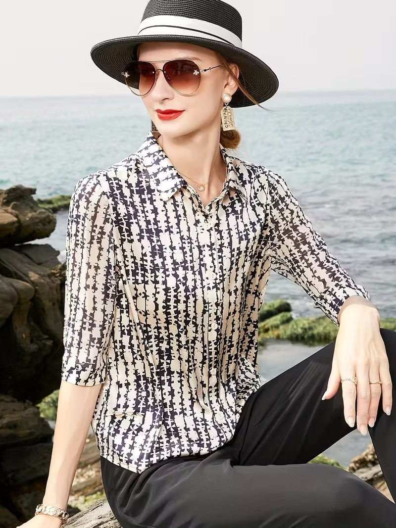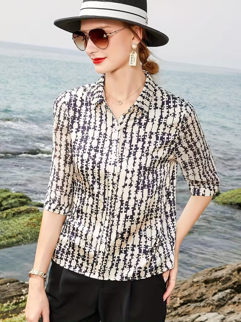 Ta damska bluzka ma kołnierzyk oraz zapięcie na guziki z przodu. Rękawy sięgają tuż poniżej łokcia, a fason bluzki zakończony jest prostym dołem. Bluzka ma abstrakcyjny wzór.