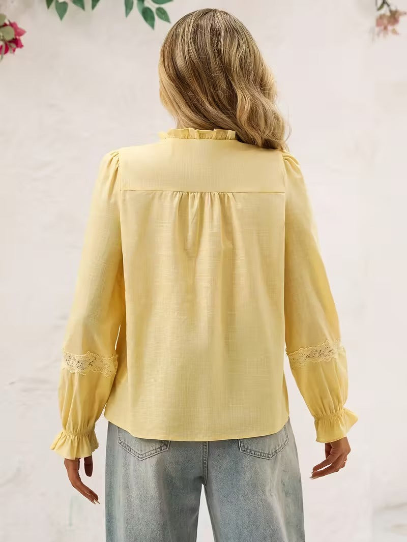Ta damska bluzka ma wysoki falbankowy kołnierz oraz zapięcie z przodu na małe, okrągłe guziki na całej długości. Po obu stronach listwy guzikowej znajdują się pionowe panele z koronki. Rękawy są długie i zakończone falbanką przy mankietach.