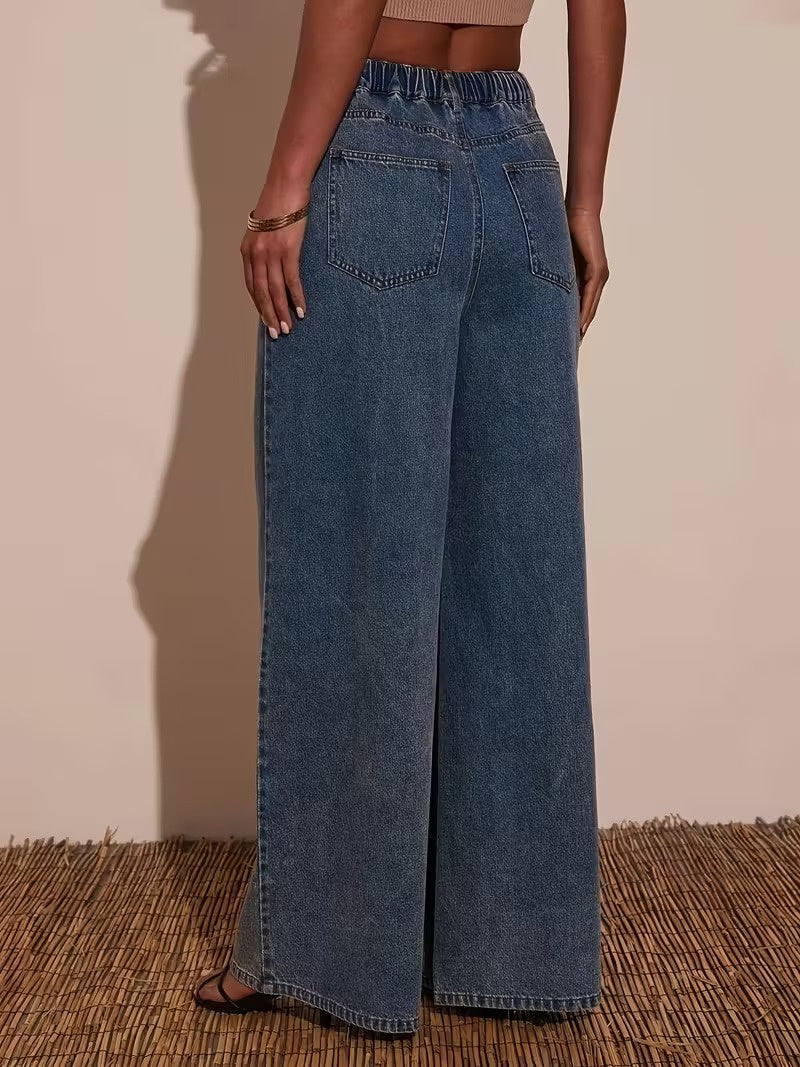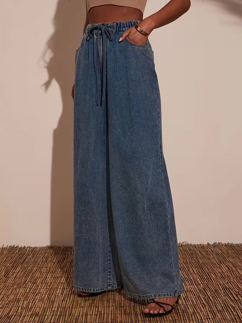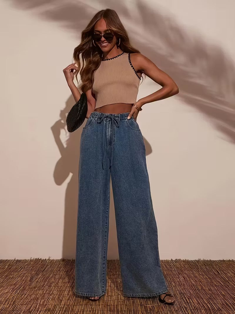Te damskie dżinsy mają wysoki stan i szerokie nogawki o jednolitej szerokości od uda aż po kostkę. W pasie znajduje się sznurek umożliwiający regulację dopasowania. Dżinsy mają dwie ukośne kieszenie z przodu oraz dwie naszywane kieszenie z tyłu.