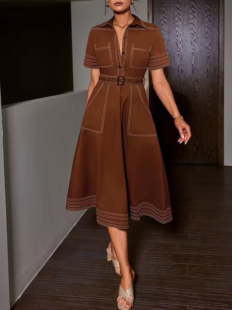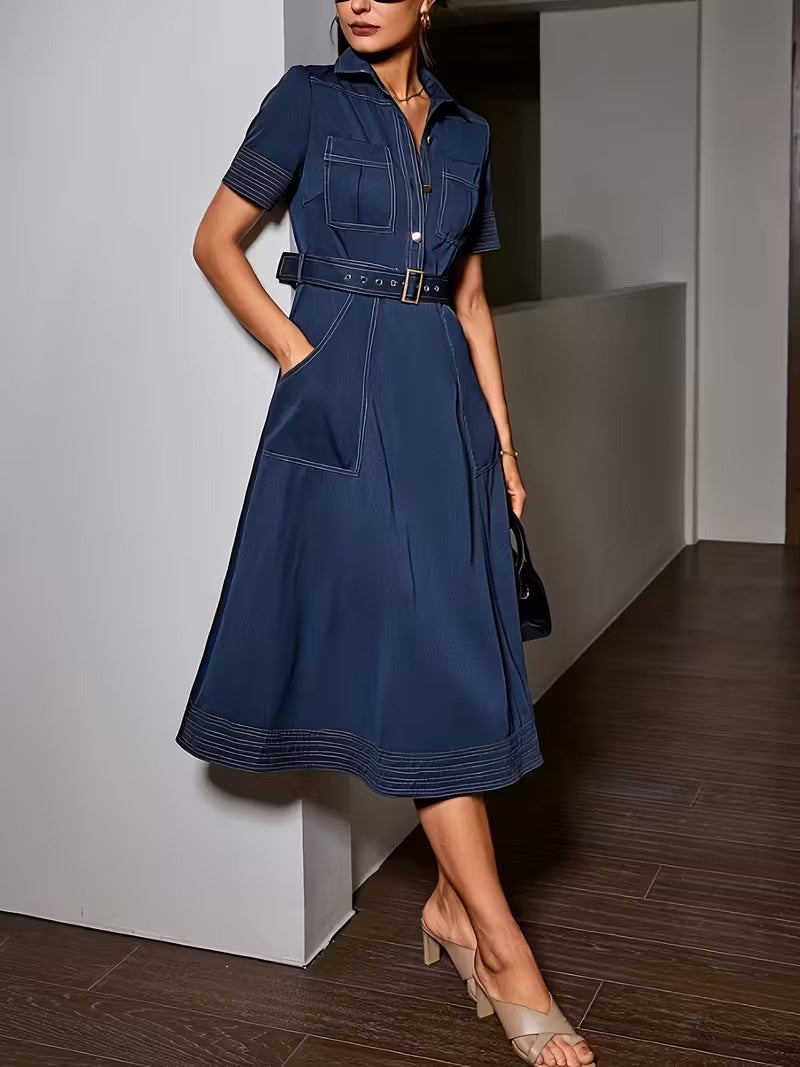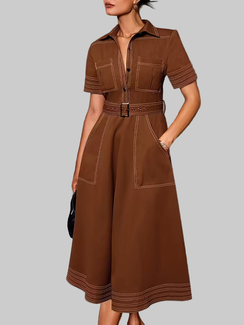 Ta sukienka midi ma krótkie rękawy i dekolt z kołnierzykiem. Sukienka posiada kontrastowe przeszycia wzdłuż szwów, kieszeni i paska. Górna część ma dwie kieszenie na klatce piersiowej, a spódnica naszywane kieszenie na wysokości bioder. Talia jest ściągnięta dopasowanym paskiem z prostokątną klamrą.