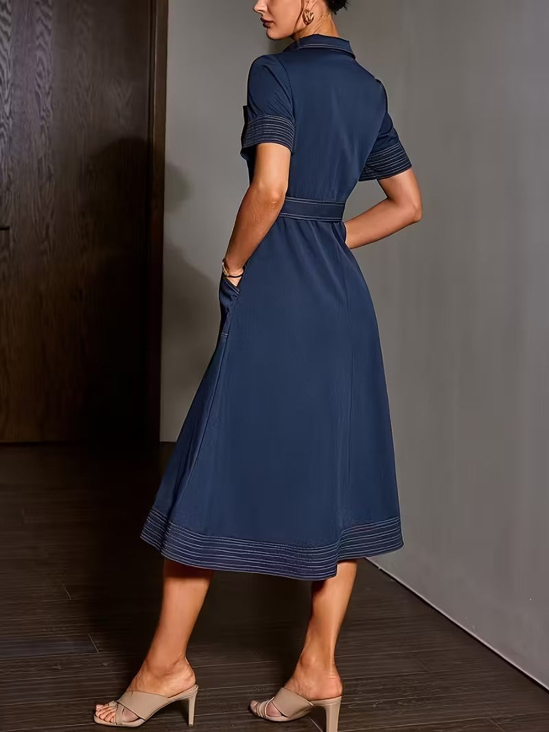 Sukienka Midi z Kołnierzykiem i Krótkimi Rękawami