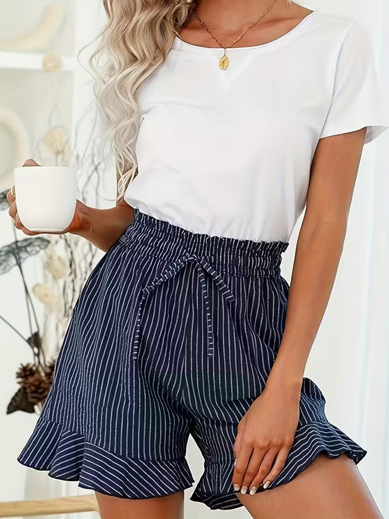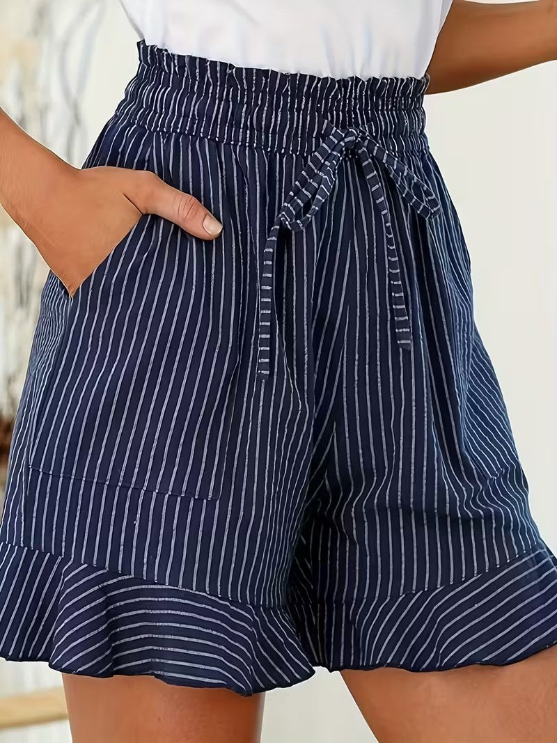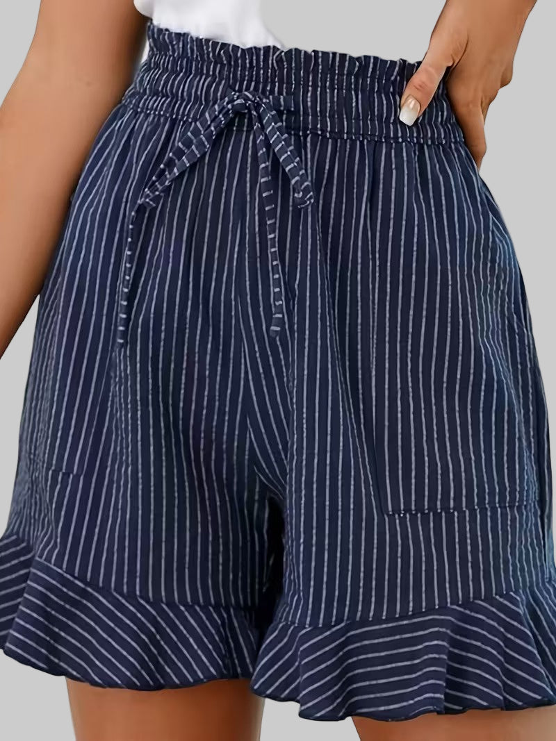 Te damskie szorty mają wysoki stan oraz sznurek do wiązania z przodu. Dół nogawek wykończony jest falbanką, a po bokach znajdują się kieszenie do przechowywania drobnych przedmiotów.