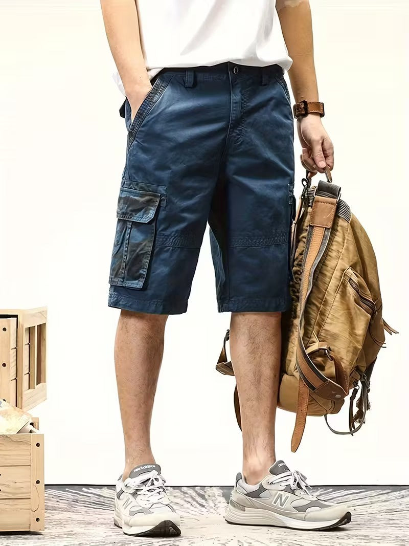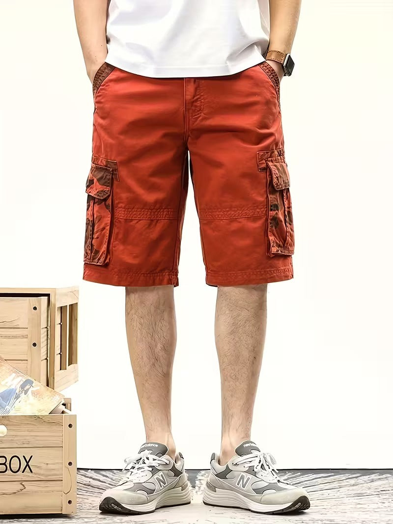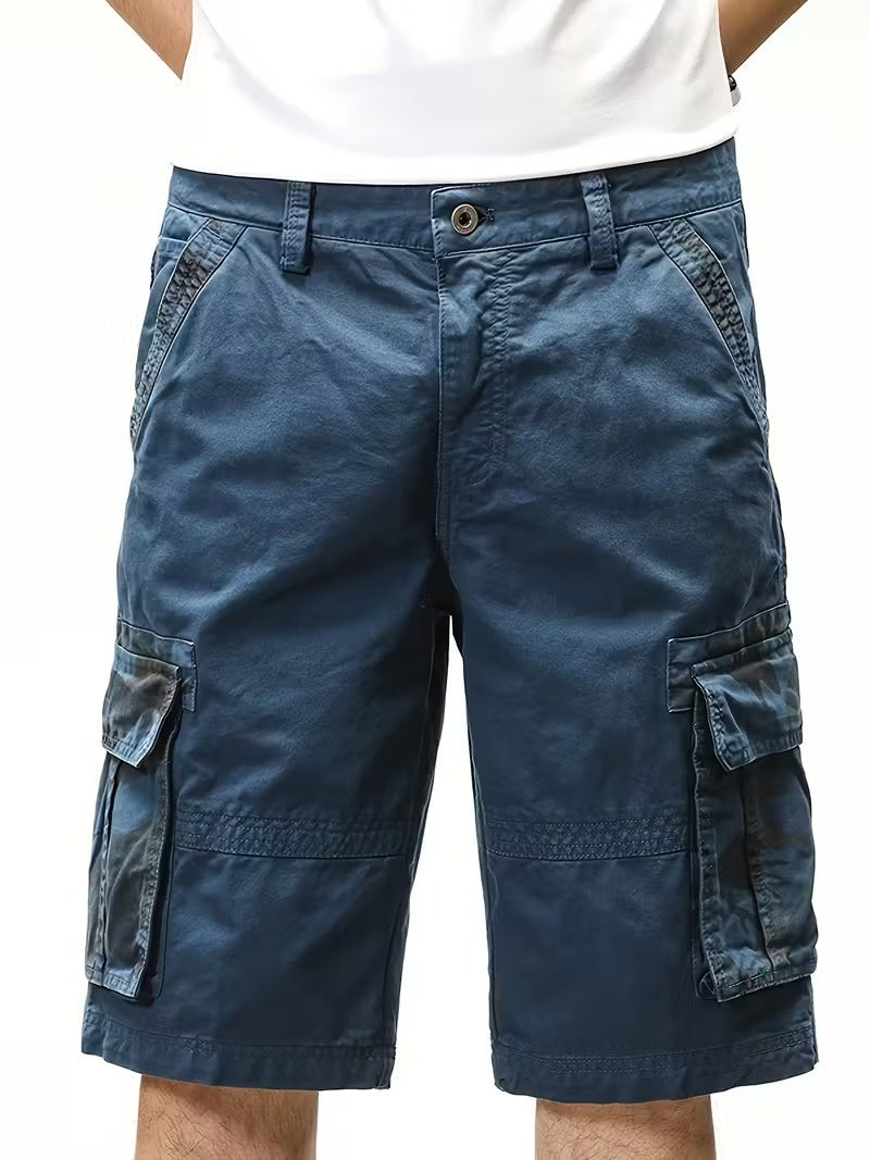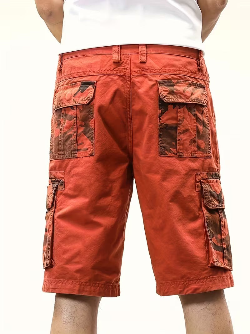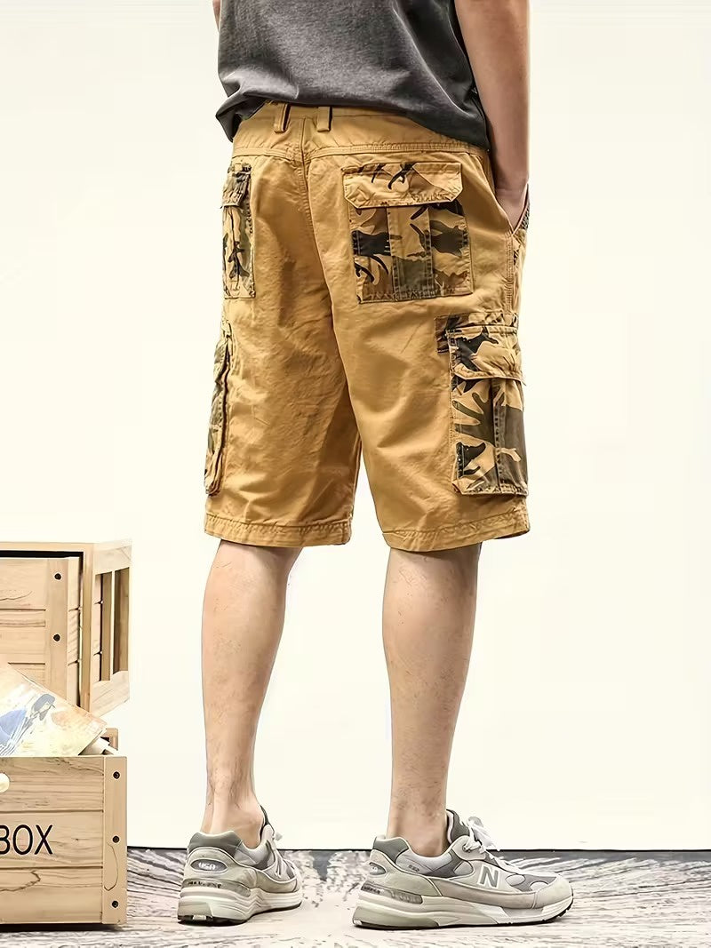 Te męskie szorty cargo mają duże kieszenie cargo po obu stronach ud oraz na plecach. Kieszenie cargo są wyposażone w klapki i wzór w kamuflażu. W pasie znajdują się szlufki na pasek oraz zapięcie na guzik. Dodatkowo szorty mają standardowe skośne kieszenie z przodu i sięgają do kolan.