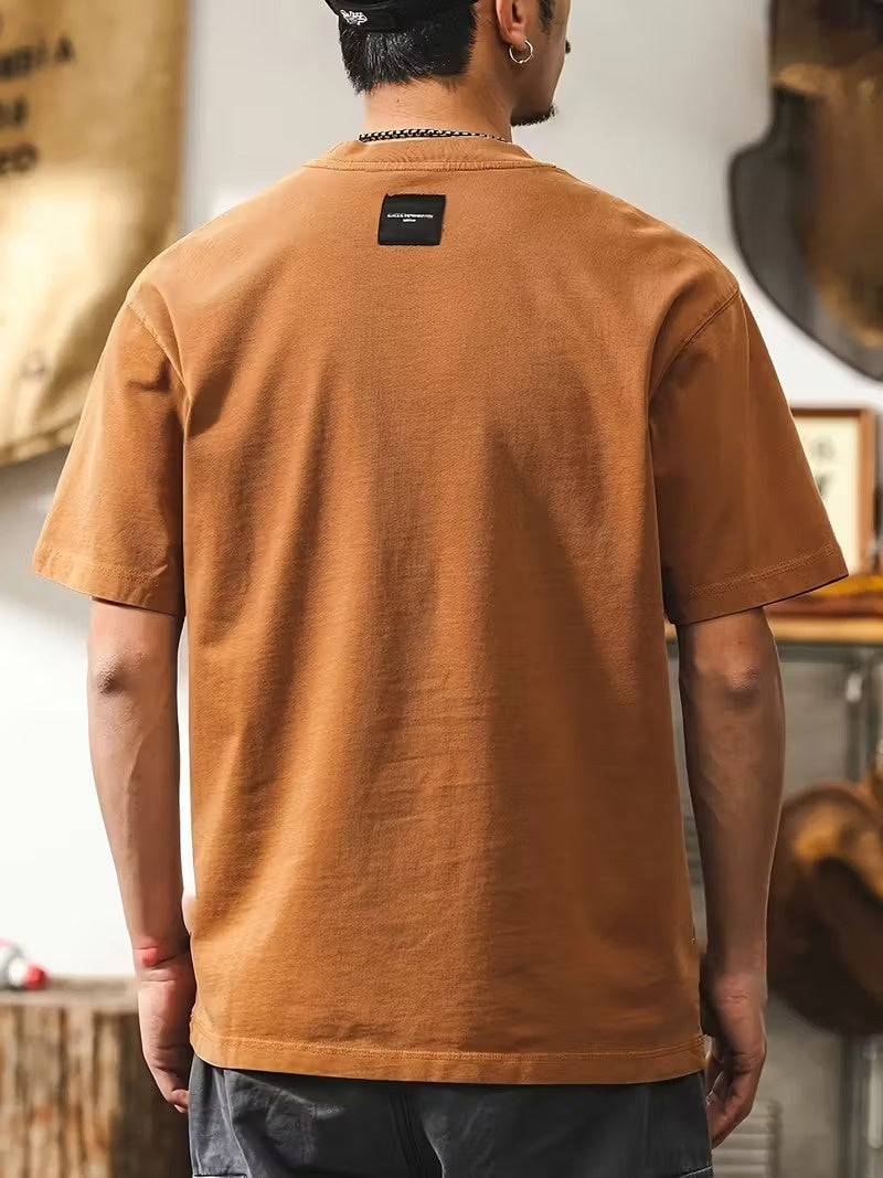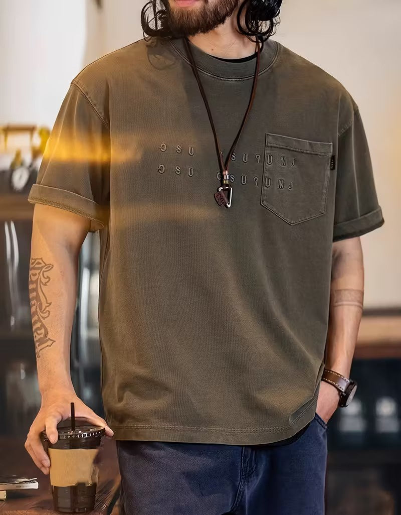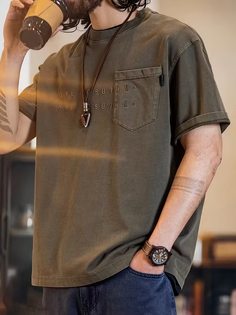 Ta męska koszulka ma krótkie rękawy oraz okrągły dekolt. Rękawy sięgają mniej więcej do połowy ramienia. Po jednej stronie klatki piersiowej znajduje się pojedyncza kieszonka, a na klatce piersiowej umieszczony jest subtelny, wytłoczony napis w dwóch rzędach.